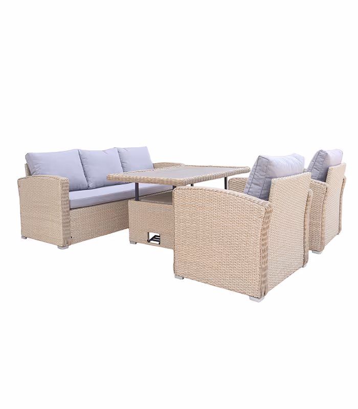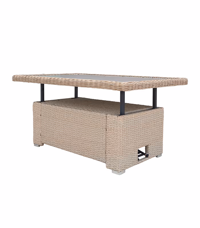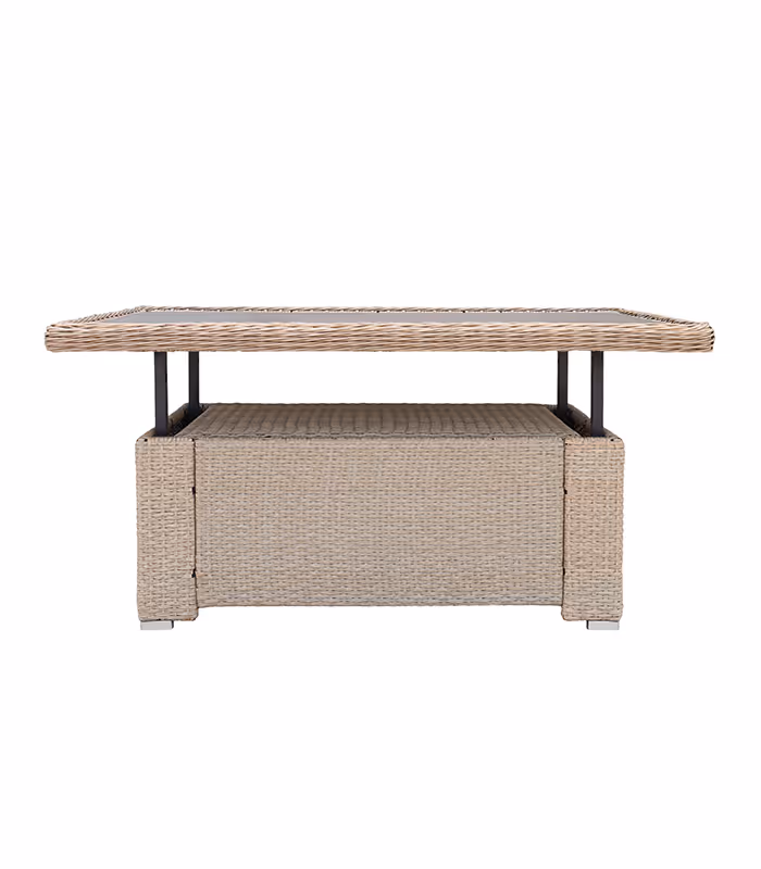 Velký stabilní stůl s funkcí nastavení výšky poskytuje pohodlné místo pro sdílená jídla a pohodlná sedadla s měkkými ergonomickými polštáři zaručují pohodlí i při dlouhých setkáních. Kombinuje praktický jídelní kout s útulným koutkem odpočinku - ideální pro ranní kávu, grilování nebo večerní rozhovory.