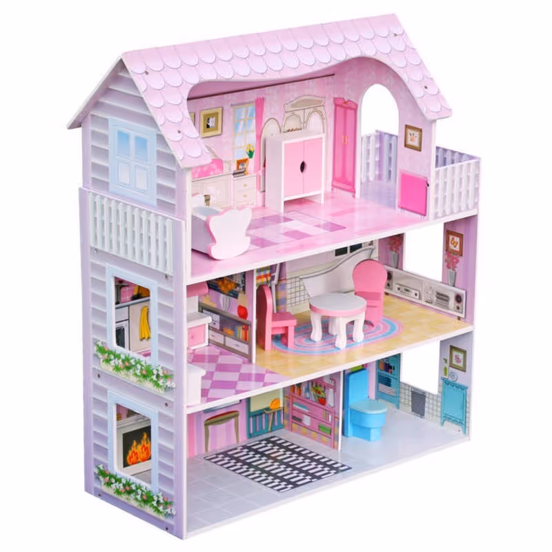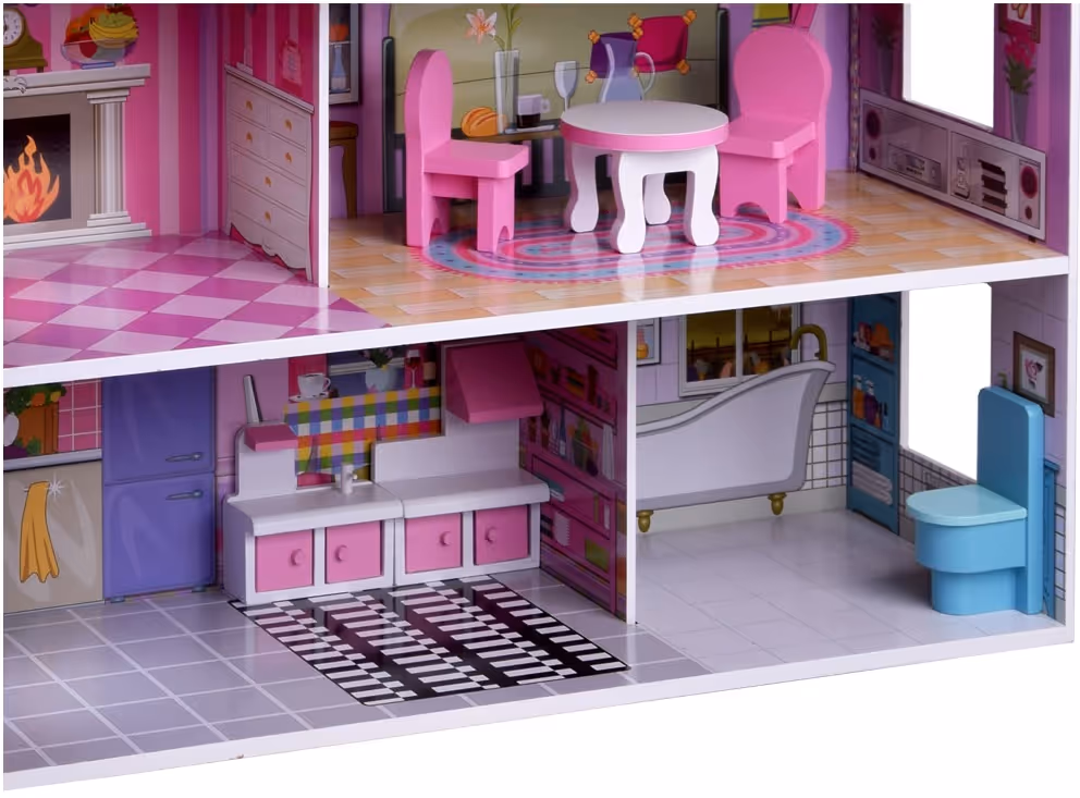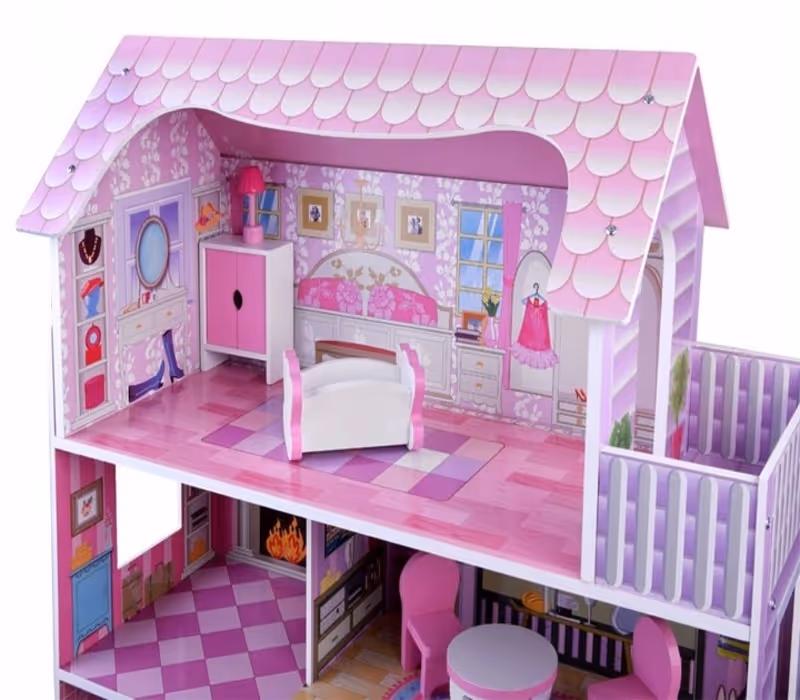A babaház a legmagasabb minőségű természetes fából - MDF lapból - készült. Nagy méretű és masszív kivitelezésű. 3 szintből áll, a készlet a fő hálószobából nyílik bejárat az erkélyre. A belső terek tökéletesen lemásolják a valódi házat. Belül található: fürdőszoba, nappali, étkező, konyha és tetőtéri szoba erkéllyel.