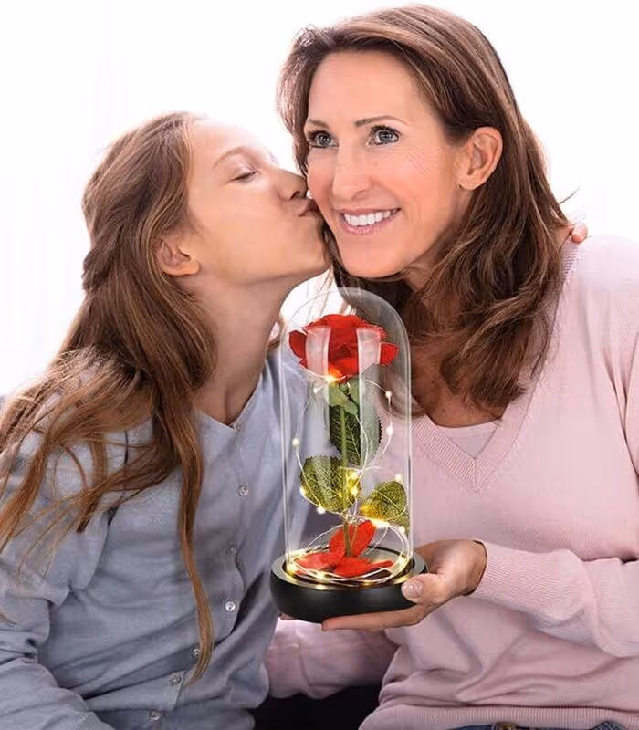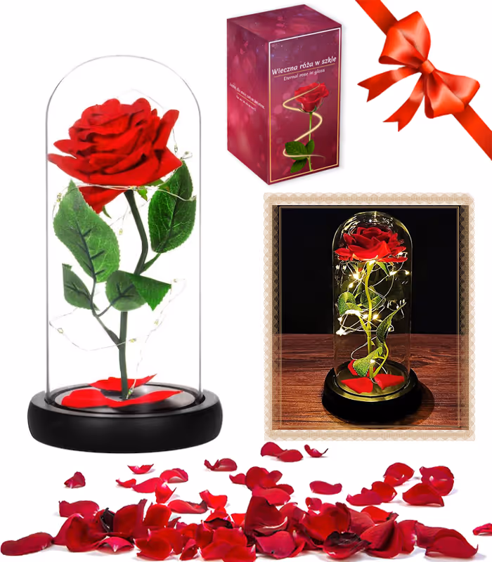 A virágot üvegkupola zárja, amely megvédi a portól és a sérülésektől. LED fényekkel van körülfonva, amelyek csodálatos ragyogást kölcsönöznek és nagyon hangulatos légkört teremtenek. Az egészet egy elegáns dobozba csomagolják, amely készen áll az ajándékozásra. Egy ilyen ajándék sokféle alkalomra alkalmas. A legfontosabb, hogy a rózsa soha nem fog elhervadni, és évekig díszítésként szolgál majd. Optimális mérete 21 x 10 cm, nem foglal sok helyet a polcon, és elég nagy ahhoz, hogy mindenki láthassa.